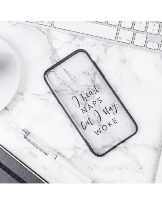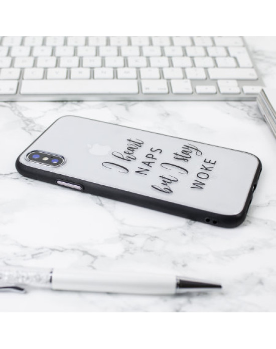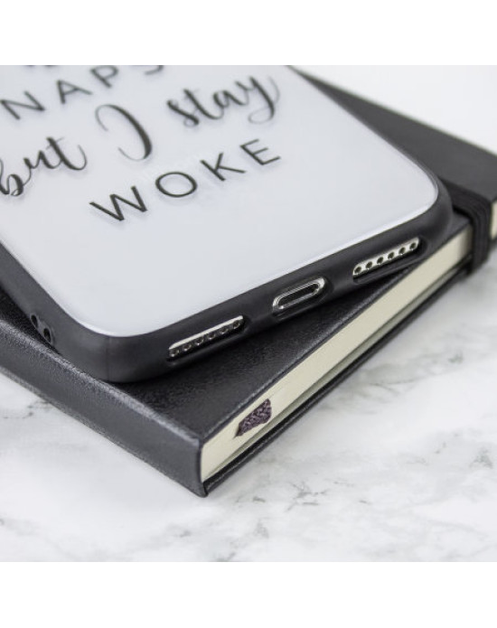 Girls, you're empowered,, fully capable and you know what's going on around you. Let nobody doubt this as you make a statement with your iPhone X in this fabulous fashion case from LoveCases - the most hip and happening fashion case brand around. A flexible black bumper frames a hard polycarbonate crystal-clear back, adorned with the statement 'I Heart Naps But I Stay Woke'.