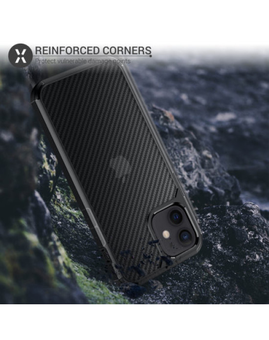 The Olixar ExoShield Carbon case features semi-transparent back with a sleek carbon fibre design, that subtly showcases the Apple logo and adds a premium look to your iPhone 12.