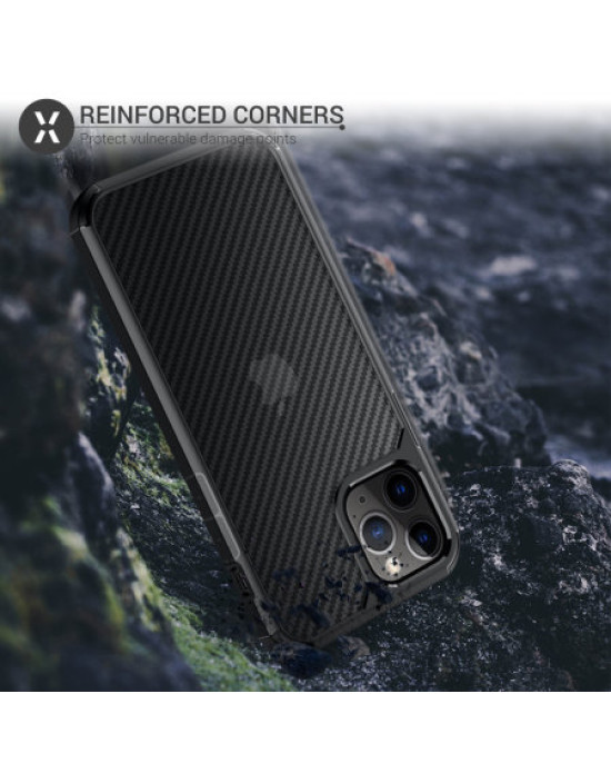 The Olixar ExoShield Carbon case features semi-transparent back with a sleek carbon fibre design, that subtly showcases the Apple logo and adds a premium look to your iPhone 12 Pro.