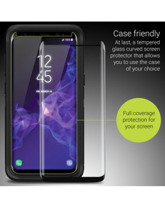 This ingenious solution to protecting your S9's screen involves a tempered glass protector that covers most of the the edges of the curved screen, allowing you to use most cases on the market with it too. The underside of the screen protector sits flat on the screen and follows the contours of your phone's screen perfectly. This covers the entire screen and offers complete protection. No more compromising by leaving the curved edges exposed and this also ensures no dirt will get in - so no more "halo effect". By allowing you to use a case, you can have the complete protective solution for your phone.