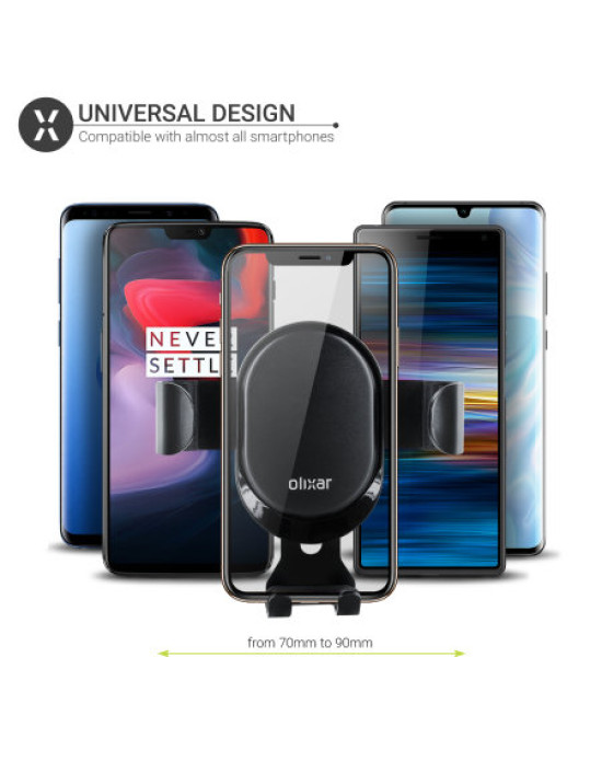 Designed to accommodate virtually any smartphone, the Olixar inVent Gravity car holder accommodates devices from a width of 70mm up to 90mm in width, making it suitable for larger devices such as the iPhone XS Max, Samsung Galaxy Note 9 and more.