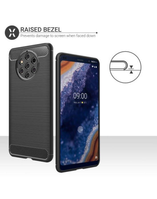 Protect your phone from scratches, knocks and drops with the Olixar carbon-fibre protective case for the Nokia 9 Pureview Featuring a rugged, flexible, textured TPU body and that is tough enough to protect your device, without adding unnecessary bulk. The flexible and robust TPU core features shock absorbing strength allied with a stunning carbon-fibre and brushed metal style finish on the back. The inner patterns also help deflect shock force and aid heat dissipation.