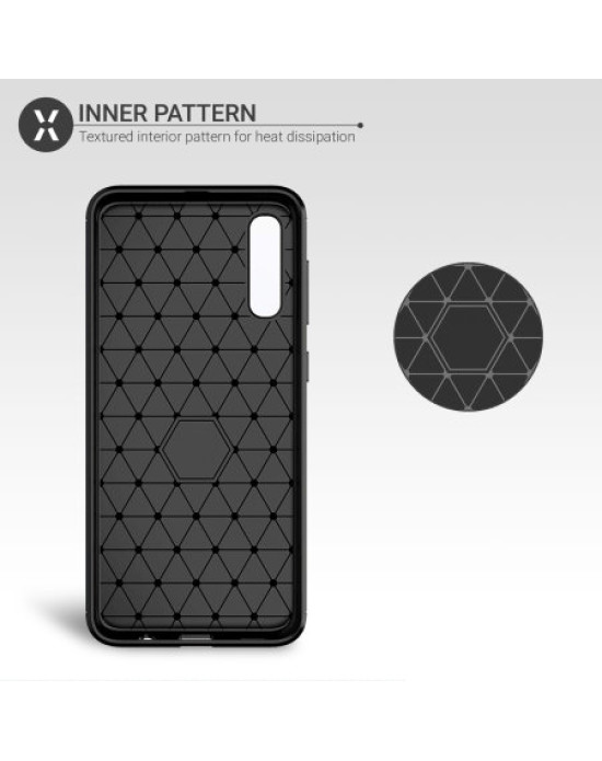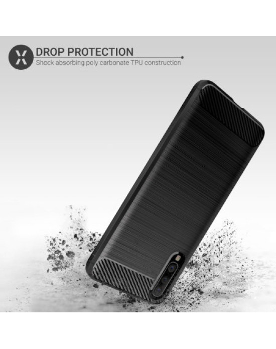 Protect your phone from scratches, knocks and drops with the Olixar carbon-fibre protective case for the Samsung Galaxy A50. Featuring a rugged, flexible, textured TPU body and that is tough enough to protect your device, without adding unnecessary bulk. The flexible and robust TPU core features shock absorbing strength allied with a stunning carbon-fibre and brushed metal style finish on the back. The inner patterns also help deflect shock force and aid heat dissipation.