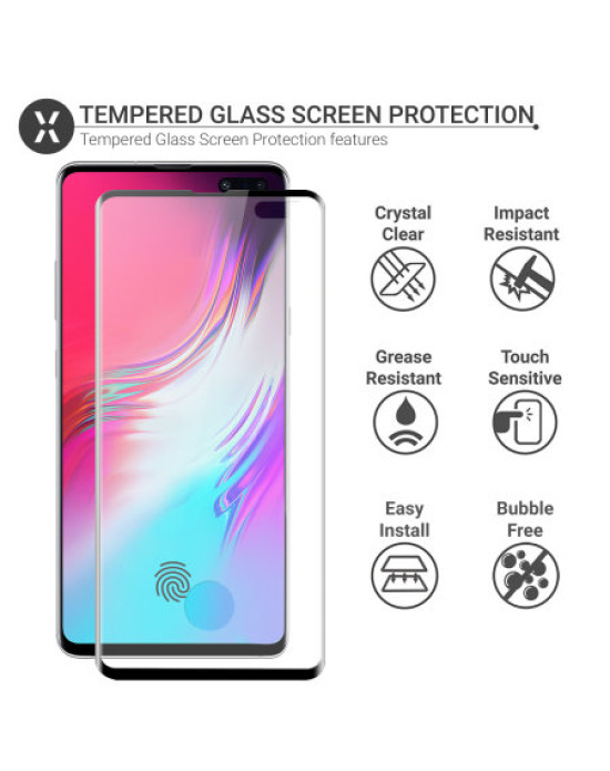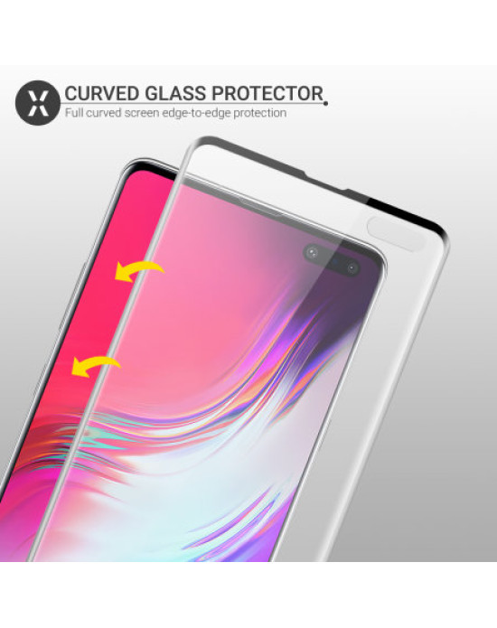This ingenious solution to protecting your Samsung Galaxy S10 5G screen involves a tempered glass protector that covers most of the the edges of the curved screen, allowing you to use most cases on the market with it too. The underside of the screen protector sits flat on the screen and follows the contours of your phone's screen perfectly. This covers the entire screen and offers complete protection. No more compromising by leaving the curved edges exposed and this also ensures no dirt will get in - so no more "halo effect". By allowing you to use a case, you can have the complete protective solution for your phone.