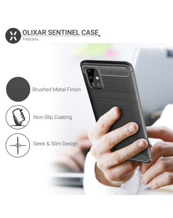 Protect your phone from scratches, knocks and drops with the Olixar Sentinel for the Samsung Galaxy A71. Featuring a rugged, flexible, textured TPU body and that is tough enough to protect your device, without adding unnecessary bulk. The flexible and robust TPU core features shock absorbing strength allied with a stunning carbon-fibre and brushed metal style finish on the back. The inner patterns also help deflect shock force and aid heat dissipation.