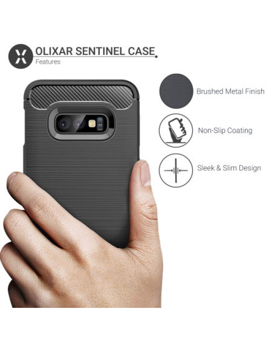Protect your phone from scratches, knocks and drops with the Olixar Sentinel for the Samsung Galaxy S10e. Featuring a rugged, flexible, textured TPU body and that is tough enough to protect your device, without adding unnecessary bulk. The flexible and robust TPU core features shock absorbing strength allied with a stunning carbon-fibre and brushed metal style finish on the back. The inner patterns also help deflect shock force and aid heat dissipation.