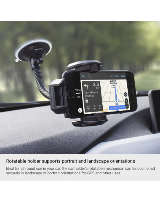 Ideal for all round use in your car, the car holder's rotatable mechanism can be positioned securely in landscape or portrait orientations for GPS and other uses.