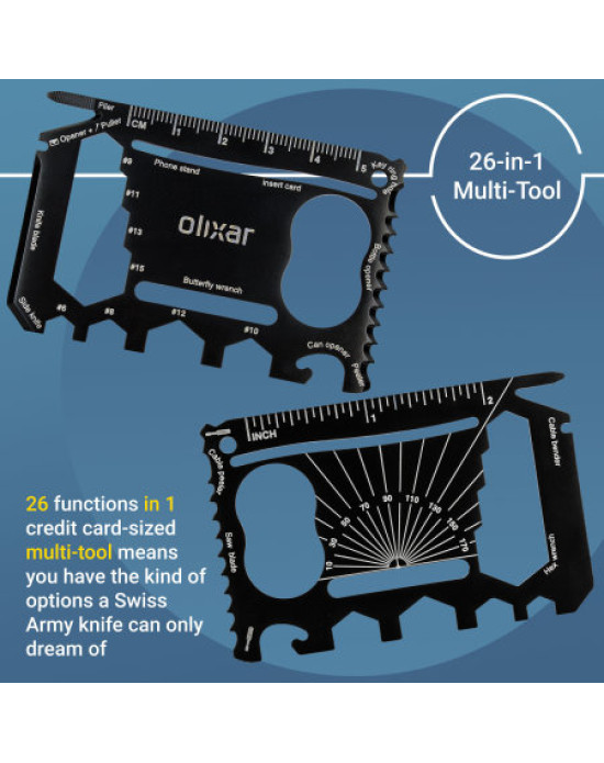 Ruler (metric and imperial), filer, screwdriver, bottle opener, can opener, cable peeler, protractor, phone stand (to be used with a credit card or similar), letter opener, puller, knife blade, side blade, saw blade, keyring hole, butterfly wrench, a hex bolt wrenches in sizes ranging #6, #8, #9, #10, #11, #12, #13 and #15. That's quite a lot from one small tool, but it's all there. Has a phone case ever provided so much capabilities? Have you ever had so much with you in one small place to take on the world? Probably not.
