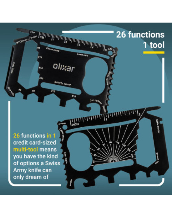Ruler (metric and imperial), filer, screwdriver, bottle opener, can opener, cable peeler, protractor, phone stand (to be used with a credit card or similar), letter opener, puller, knife blade, side blade, saw blade, keyring hole, butterfly wrench, a hex bolt wrenches in sizes ranging #6, #8, #9, #10, #11, #12, #13 and #15. That's quite a lot from one small tool, but it's all there. Has a phone case ever provided so much capabilities? Have you ever had so much with you in one small place to take on the world? Probably not.