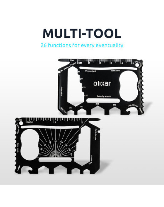 Ruler (metric and imperial), filer, screwdriver, bottle opener, can opener, cable peeler, protractor, phone stand (to be used with a credit card or similar), letter opener, puller, knife blade, side blade, saw blade, keyring hole, butterfly wrench, a hex bolt wrenches in sizes ranging #6, #8, #9, #10, #11, #12, #13 and #15. That's quite a lot from one small tool, but it's all there. Has a phone case ever provided so much capabilities? Have you ever had so much with you in one small place to take on the world? Probably not.