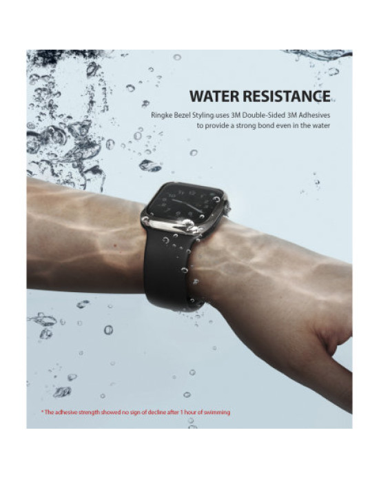 The Ringke styling bezel uses 3M double sided 3M adhesives to provide a strong bond even when under water. Moreover, the colour does not fade whilst being underwater. Tested throughout production process the adhesive strength showed no sign of decline after 1 hour of swimming.