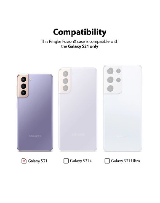 The Ringke Fusion X case offers MIL-STD 810G - 516.6 Certified Military Grade Drop Protection. This means that the Fusion X for the Samsung Galaxy S21 has been extensively drop tested, without any damage being caused to the Samsung Galaxy S21 so you can feel reassured that your device is well protected. This is, in part thanks to the Fusion X's edge protection design, which incorporates reinforced, shock absorbing TPU corners into the Fusion X's body.