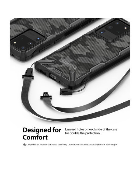 The shell has all of the appropriate cutouts for the ports and features of your Samsung Galaxy S20 Ultra such as the camera and flash. The Fusion X Design also includes TPU hardened, responsive buttons and a USB-C port cover for extra protection. Looking for a convenient way to carry your Samsung Galaxy S20 Ultra? The Ringke Fusion X Design case includes lanyard cutouts for an easy way to securely carry your Samsung Galaxy S20 Ultra.