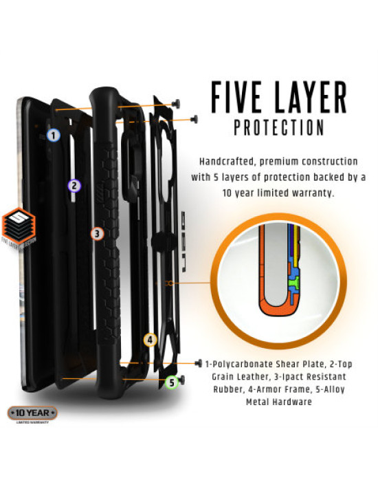 So what are these 5 layers? The first is armoured frame that protects the outer extremities of the phone in all directions. The second is top grain leather. Not only is this a very attractive material, it is also nature's own robust layer against damage and so tough as it comes. Then we have the polycarbonate shear plate that keeps everything rigid and deflects impact away from the phone. Think of this as the bones. Fourth is the metal alloy hardware. The Torx screws hold everything together firmly and as they are also on show, provide a vital visual detail of this tough-talking but luxurious case. The fifth line of defence is arguably the most crucial. Impact-resistant rubber coats the outer frame to absorb impact and provide a nice tactile grip too. By cushioning shock force, it absorbs force that is easily transferred throughout and managed by the other layers. All in all, your Mate 20 Pro is as well protected as it could ever expect to be.